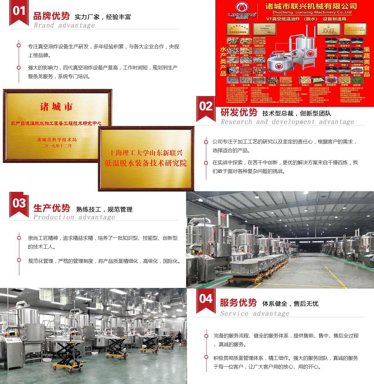 聯(lián)興第四代真空低溫油炸機(jī)顛覆了傳統(tǒng)意義上的真空油炸機(jī)工作時(shí)間長(zhǎng)、工作效率低的概念。我公司通過(guò)大量客戶(hù)使用反饋,將設(shè)備進(jìn)行改造升級(jí),同等型號(hào)同等設(shè)備較傳統(tǒng)意義上的真空油炸機(jī)工作效率提高了30%,且我公司每臺(tái)設(shè)備零部件均有存檔,方便為客戶(hù)提供便捷迅速的售后服務(wù)。
